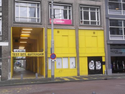 "........... “TEST SITE ROTTERDAM” staat boven het tunneltje dat is ontstaan door alle binnen- en buitenmuren van de bedrijfsruimte die er voorheen was gevestigd te slopen. ............."