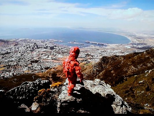 "........... Vanaf de naast de Tafelberg gelegen Duivelspiek kijkt een soort ruimtewezen naar het in de diepte gelegen Kaapstad. ............."