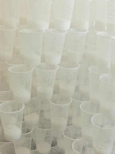 "........... In de transparante bekertjes zit een laagje zout, op de buitenkant zitten de zoutkristallen die zijn ontstaan nadat ze met een zoutoplossing waren besproeid die vervolgens door de ventilatoren werd droog geblazen. ............."