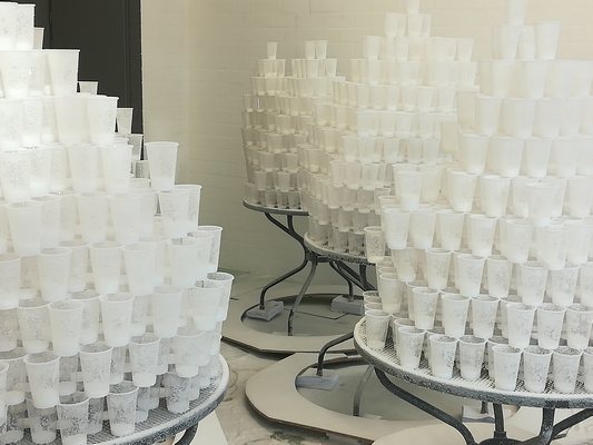 "........... Evenmin is er sprake van zo'n perfecte met champagneglazen gestapelde toren, er zit een vervorming in die mogelijk de parallax verbeeldt ............."