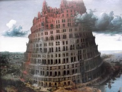 "........... Heel suggestief hangen er wat wolkjes rond de bovenkant, die hier beslist niet als laaghangende bewolking zijn bedoeld, eerder om aan te geven dat het bouwwerk de hemel al bijna had bereikt. ............."