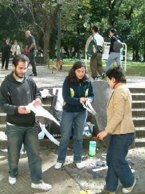 "..... Om aan alle twijfel een eind te maken, neem ik een paar foto’s vanaf het balkon en ga naar beneden om poolshoogte te nemen. En of ik gelijk heb. Pablo, Carmen en Luciana (vlnr op de foto), studenten Grafische Vormgeving aan de UBA, de Universiteit van Buenos Aires, zijn bezig met het maken van een openbaar proefwerk."