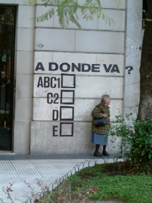 ".......De stelling bestaat uit een meerkeuzevraag met vier mogelijkheden ABC1, C2, D en E. Dit zijn de klassen waarin de wereld van de adverteerders deze consumptiemaatschappij heeft ingedeeld. Van kapitaalkrachtig tot zeg maar arm. Heel toepasselijk zal even later onze vaste bedelares juist daar om een “moneda” een geldstukje vragen. Zij valt overduidelijk in klasse “E”, niks te verteren............"