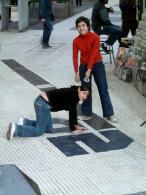 "......Carmen en Luciana plakken de laatste stelling “El que no piensa, no se educa - hij die niet nadenkt, wordt niets wijzer” op de tegels van de chique winkelstraat Florída....