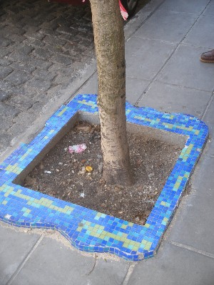 "........... Een randje gekleurde terrazzosteentjes tegen de gevel en rondom de in het troittoir uitgespaarde ruimte rond een boom. ............."