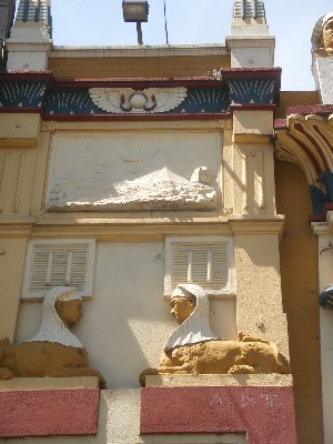 "........... Sfinxen boven de ingang en obeliskjes en een reliëf met een piramide en een sfinx in de woestijn. Cheops? ............."