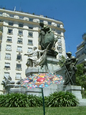 “...........De uit carrara marmer gehakte beeltenis van de president valt bijna in het niet bij de grote bronzen Argentijnse maagd die hoog boven hem uittorent. Het door een sponsor goed onderhouden grasveldje rond dit toch wel wat wanstaltige monument is voor de afwisseling niet saai grijs, maar saai groen. Zowaar fleurig in deze buurt..............."