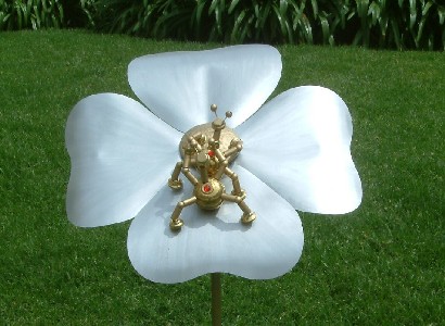 .............Mildred Burton heeft de klaverblaadjes zilvergrijs gelaten en in het hart van de bloem een soort mechanische bij geïnstalleerd. ................."
