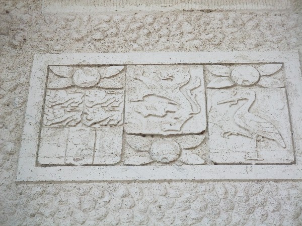 "........... Die wapens horen helemaal niet in zijn oeuvre thuis en zijn hem vast en zeker door de architect door de strot geduwd om als beginnend kunstenaar de opdracht binnen te kunnen halen. Hij gaf ze echter wel een eigen accent door er een zon of een bloem bij te beitelen. ............."