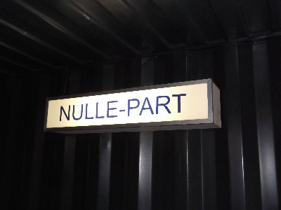 "........... in de donkere gang van de entree twee stationslichtbakken die de arriverende bezoeker de optie bieden naar PARTOUT of NULLE-PART te reizen, oftewel naar OVERAL of NERGENS. ............."