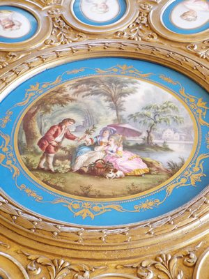 "........... een ronde Louis XVI salontafel ervoor. De rand van die tafel is ingelegd met 12 kleine portretten van hofdames, in het midden een familietafereel: Marie Antoinette met haar derde kind Louis Charles. ............."