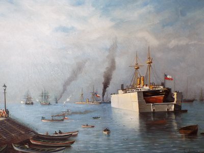 "........... op een havengezicht uit 1892 van de Muelle Prat staat prominent een drijvend reparatiedok. ............."