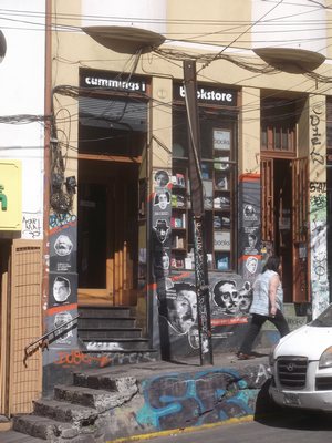 "........... en een boekwinkel waar de koppen van de schrijvers van wie de boeken binnen te koop zijn op de buitengevel staan geschilderd. ............."