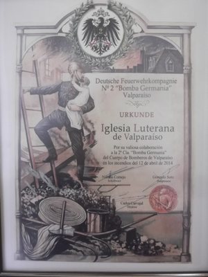 "........... Eigenlijk is het leukste in de kerk een URKUNDE die is toegekend door de Deutsche Feuerwehrkompagnie Nº 2 “Bomba Germania” Valparaíso ............."