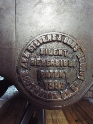"........... in het midden: ”SILENT REVERSIBLE PATENT 1887” ,en langs de rand: ”Stevens & Sons, 237 Southwark Br Rd London.” ............."