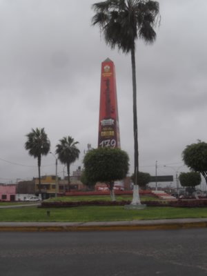 "........... De rode obelisk op een rotonde roept op tot het vieren van de 179ste verjaardag van Callao. Een foto ervan maken mag alleen via het iets omlaag gedraaide autoraampje, ............."