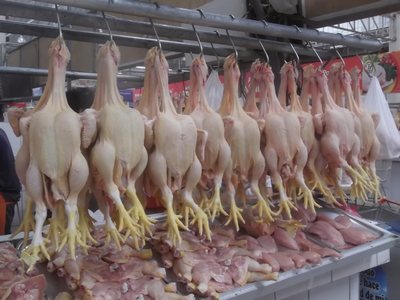 "........... de grootste verrassing komt echter bij de kippenkramen. De “dames” hangen geheel ontkleed aan haken te pronken, ............."