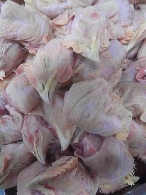 "........... een schaal met koppen. Ik vraag of Peruanen dit allemaal eten. “Welnee joh. De koppen gebruiken we als honden- of kattenvoer en van de poten kun je een heerlijke bouillon trekken.” ............."