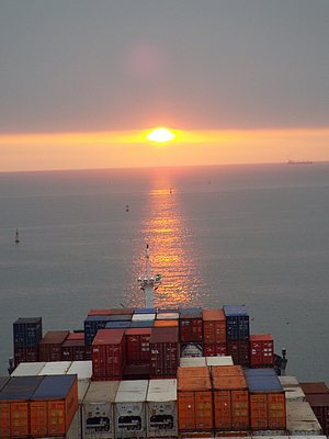 "........... Precies om 6 uur varen we door de havenmond, recht vooruit zakt na een grijze dag de ondergaande zon prachtig door de wolken. ............."