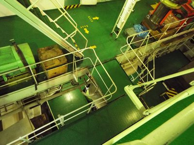 "........... Trap af, nog een een trap af en nog een. De vloeren zijn groen geschilderd, er staan gele pijlen op die naar de “exit” wijzen. ............."