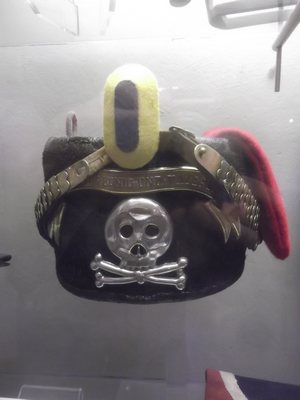 "........... Het metalen doodshoofd op de kolbak, het hoofddeksel van een Huzaar uit Brunswijk ............."
