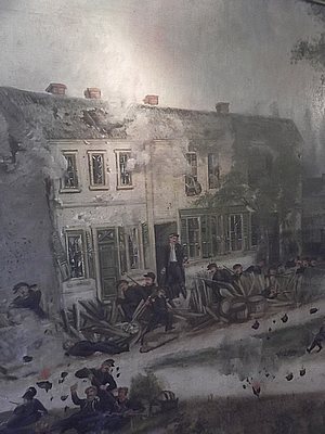"........... Geweervuur uit alle ramen, in de deuropening staat een officier met een sabel in de ene hand en een pistool in de andere. Hij moet levensmoe zijn geweest want om hem heen wordt nog stevig geschoten. ............."