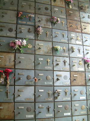 ".......... Twee lagen diep zijn er ontelbare galerijen met “opbergruimtes” gebouwd waarin volwassen zes hoog en kinderen twaalf hoog in “nichos” - het best te vergelijken met de laden van een archiefkast - worden bijgezet. .............."