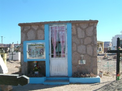 "........in het nieuwere deel wordt hier en daar beton gebruikt. Het graf van Emilia Martinez ziet er gezellig uit. Het is een soort betonnen volkstuinhuisje. In de deur hangt een vrolijk gekleurd keukengordijn. Echt huiselijk. ..........."