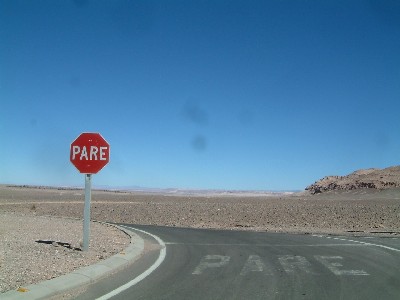 "........ Stel je voor: een woestijn waar een gladde asfaltweg doorheen loopt met hier en daar een afslag of een gelijkvloerse kruising. Soms is dat een voorrangskruising waar het rode stopbord “PARE” naast staat, voor de zekerheid is hetzelfde woord ook nog eens groot op het asfalt geschilderd. En wat ik nu zo geinig vind is dat iedere automobilist die in dit volkomen verlaten gebied voorbijkomt, opzichtig uitgebreid stopt en daarna even opzichtig uitgebreid naar links en naar rechts kijkt alvorens de kruising op te rijden. Alsof ze hun rijexamen aan het doen zijn.