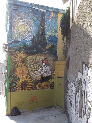 "........... Op een zijgevel elders een ode aan Vincent van Gogh, een mediterraan landschap met zonnebloemen, een zaaiende boer, cypressen en natuurlijk een zon zoals de grote meester, naar wie mijn oudste zoon is vernoemd, die zou schilderen. ............."
