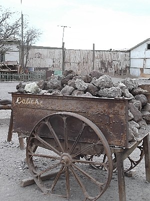 "........... Bij de ingang van het aan de overkant van de weg gelegen Oficina Salitrera Santa Laura staan wat verroeste kiepwagens met brokken “caliche” de ruw gemijnde kalksteen waaruit het nitraat nog moet worden losgeweekt. ............."