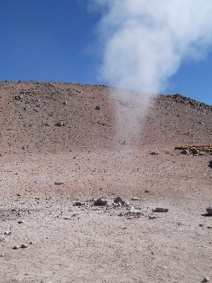 "........... Uit kleine gaten in de aardkorst komen met grote kracht pluimen stoom te voorschijn zoals uit een snelkookpan of een fluitketel waarin het water het kookpunt heeft bereikt, slechts het fluiten ontbreekt hier. ............."