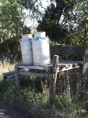 "........... en zien tot onze blijde verrassing de eerste bewijzen al: ouderwetse melkbussen die langs de weg op een houten platformpje staan te wachten om te worden opgehaald ............."