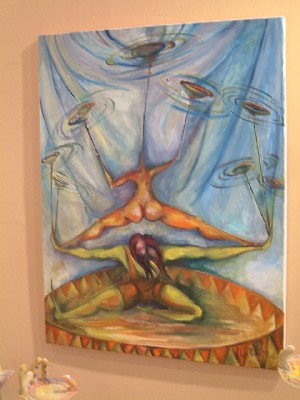 "........Er zijn een paar schilderijen die meer dimensionaal worden gepresenteerd. Rondom “de Messenwerper” steken de messen die hun doel hebben gemist uit de muur. Voor “de Clown op wielen” die in plaats van voeten wieltjes heeft, is een oprijlaantje gebouwd en voor de “Chinese bordjes“ staan ontbijtbordjes op bamboerietjes te draaien. ..........."