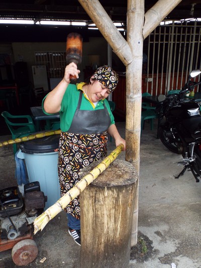 "........... ze pakt een stevige houten klopper en begint de stengel op een soort hakblok grondig te pletten. ............."