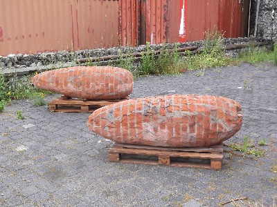 "........... op houten pallets ligt bewerkt sloopafval dat geduldig lijkt te wachten op een heftruck die ze in een containers moet gaan tillen. ............."