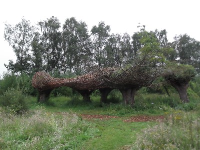 "........... Van een vijftal knotwilgen maakte Will Beckers een levend kunstwerk. Hij vlecht de takken in elkaar en snoeit ze dusdanig dat ze een geheel worden, net een grote mand van wilgentenen die op de stammen rust. ............."
