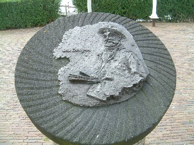 ".............Weggestopt achter de molen, een op een molensteen gemonteerd onooglijk gedenkteken voor de schilder Kees van Dongen (Delfshaven 1877 - Monaco 1968). Van Dongen werd beroemd door zijn kleurrijke schilderijen en elegante society portretten. Zijn succes als portretschilder verklaarde hij eens als volgt “door de vrouwen wat kleiner en hun juwelen wat groter schilderen.” In zijn geboortestad wordt hij daarom gepast geëerd met een grote molensteen. ...............