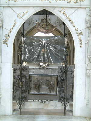 "................. Op de plek in het gebouw waar de armen van het kruis elkaar kruisen, staat het imposante marmeren praalgraf waar de resten van Columbus zouden liggen. In een kist die is ingepakt in grijze plastic folie, type vuilniszak. ..................."