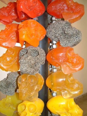 "..........Toen de kunstenares de smaak van het werken met doodskoppen eenmaal te pakken had, maakte ze er eerst een heleboel van plastic die ze aan een soort totempaal spijkerde..............."