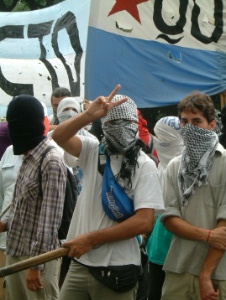 "..........Aan de gemaskerde gezichten van de met stevige houten knuppels bewapende voorhoede is te zien dat extreem links zich aan het verzamelen is. .............."