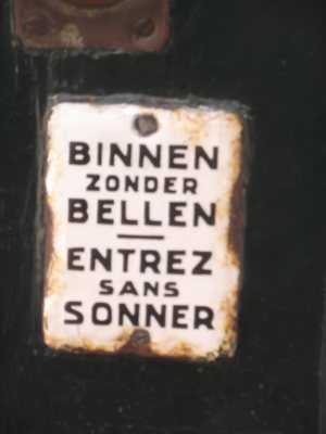 "........... Naast een niet meer in gebruik zijnde toegangsdeur is men vergeten het overbodige geëmailleerde bordje “BINNEN zonder BELLEN – ENTRER sans SONNER” weg te halen. ............."