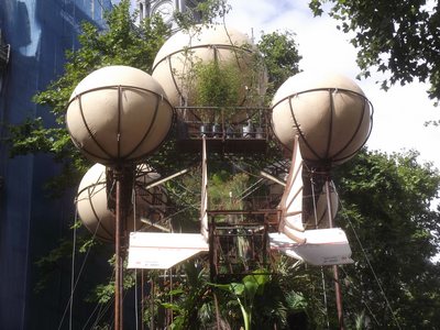 "........... In tegenstelling tot die beelden heeft deze constructie een aantal platforms en lijkt door grote ballonnen overeind te worden gehouden én het heeft het staartstuk van een ouderwets vliegtuig en twee propellers. ............."