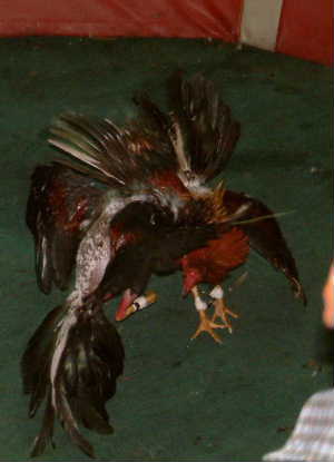"............ De hanen vechten fanatiek. De kragen staan overeind, de staartveren breed uit, als waaiers. Ze dansen, ze vliegen, ze pikken elkaar vooral naar de ogen en de hals, die mesjes aan de poten spelen geen rol van belang. ..............."