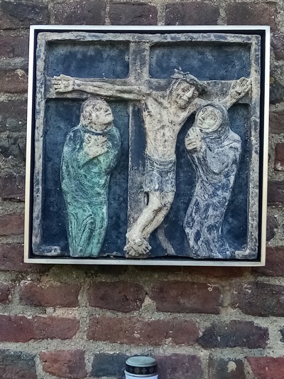 "........ Aan de overkant figuratieve kunstwerken die minder uitleg nodig hebben. Zo hangen aan de lange buitenmuur de 14 staties van de Kruisweg ............."