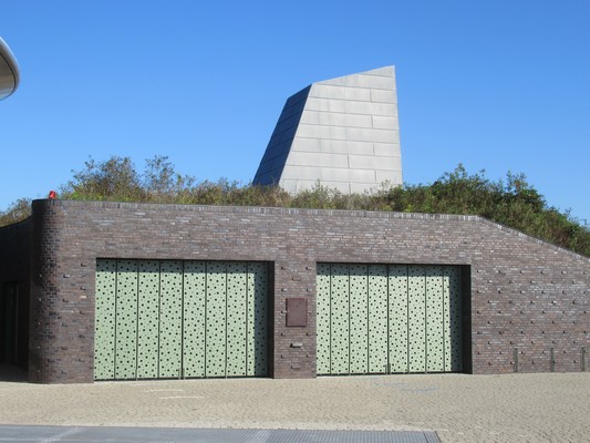 "........ zagen we wat op twee grote garagedeuren onder een daktuin leken te zijn waar een modernistische schoorsteen of, wie weet, een mooi vorm gegeven luchtkoker bovenuit stak ............."