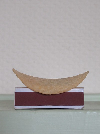 "........ Nadat er zowaar nu een chipje op het luciferdoosje lag, moest dat er ook nog eens à la Schütte worden opgelegd. Dat viel niet mee. Nadat er weet ik niet hoeveel Pringles op de vloer in stukken waren gevallen, lukte het uiteindelijk toch ............."
