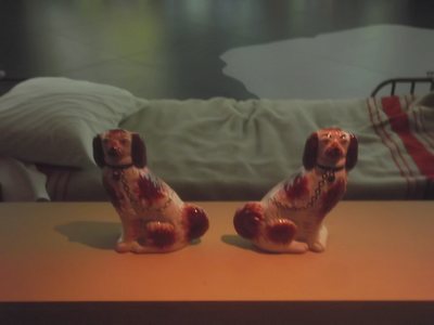 "........... Op de vensterbank staan twee hondjes van aardewerk, Engels porselein uit het Graafschap Staffordshire. ............."