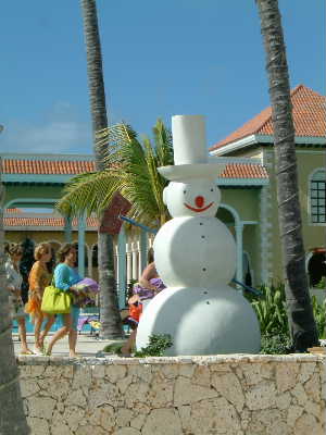 "............ Op het witte zandstrand van Punta Cana - stralende zon, blauwe zee, groene palmen - staan sneeuwpoppen van kunstsneeuw. ..............."