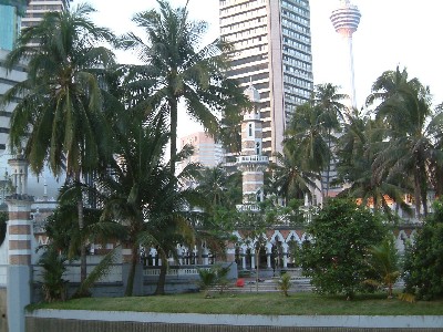 "..........Erachter vloeien de twee modderige rivieren samen en ligt de oudste moskee van KL, de Masjid Jame - de Jame Moskee. Het lage moskeegebouw verdwijnt steeds verder in de onophoudelijk voortwoekerende betonnen stadsjungle............."